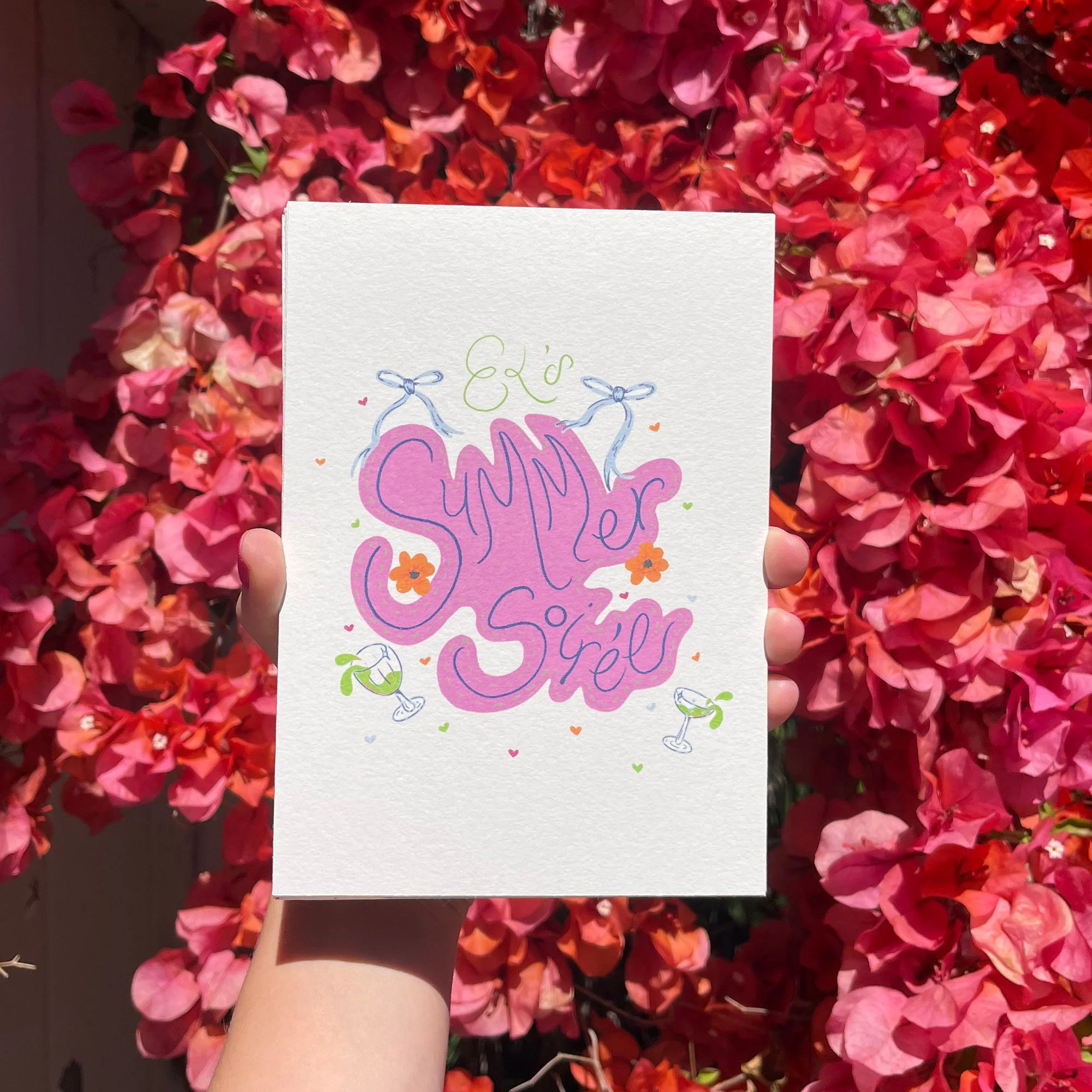Who doesn’t love a party & a little humor? A personal project for an intimate event I hosted. I leaned heavily into the handmade feel for an organic look full of unique charm and a touch of whimsy. 3 distinct pencil-based designs were created—a front and back for the invitations as well as a drink placard. The end result fell well within my coquette, garden party theme.